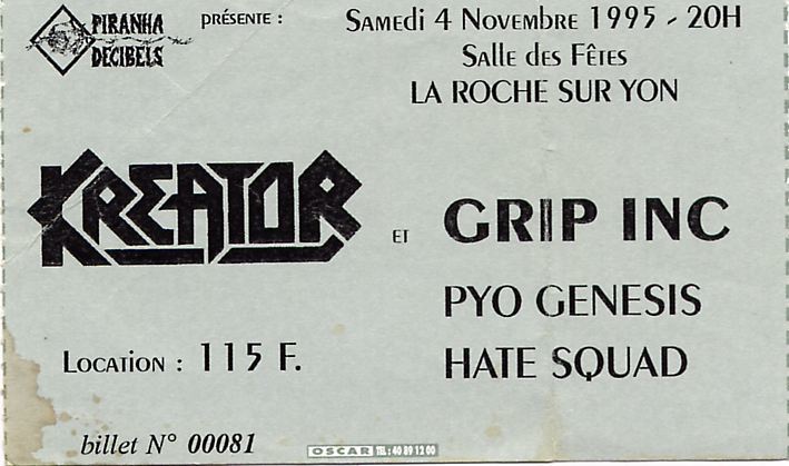 Kreator, Salle des Fêtes de Bourg sous La Roche, La Roche-sur-Yon (FR) - Nov 4, 1995