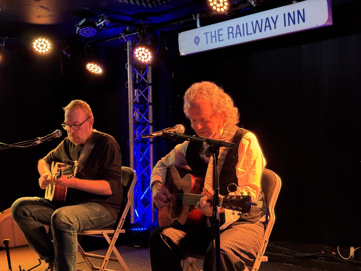 Both artists were onstage throughout , changing lead vocals on each track .Had gone to see Boo Hewerdine , who has an excellent voice and a strong back catalogue of songs . Had not heard of Reg Meuross who has clearly been around for a while . Some of his material was very good . Probably worth investigating his earlier work .v