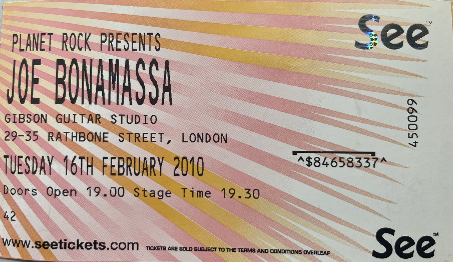 As you can see by the ticket stub, this concert was at the Gibson Guitar Studio, not the 100 Club. For some reason this app wouldn’t recognise the Gibson Guitar Studio. I won a competition at Planet Rock Radio. The price was two tickets to this exclusive intimate concert with Joe Bonamassa at Gibson. If I remember correctly, that was just over 100 people attending. It was phenomenal.